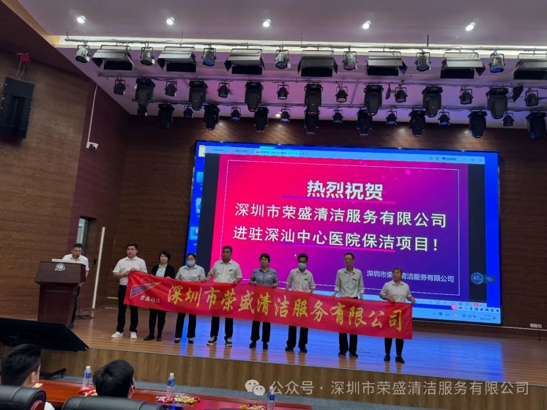 5月1日下昼四时,深圳市金地物业有限公司向导和全体项目员工搜集医院礼堂,欢庆深圳市云顶集团清洁服务有限公司正式进驻深汕中心医院,员工吃着点心,喝着饮料,看着公司宣传片,听着公司董事长热情洋溢的致词,现场一片欢悦和喜悦。